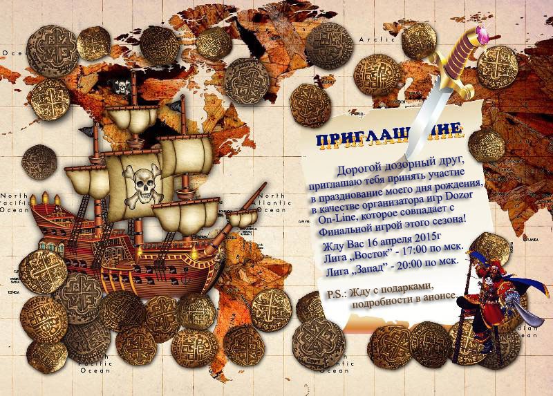 18 апреля 2013 года я провел первую игру в качестве организатора проекта Dozor On-Line. Предлагаю отметить мой дозорно - организаторский день рождения игрой. Я надеюсь, что эти два года я радовал Вас заданиями, но отметить годовщину решил по - особому. Формат игры будет баттл! Да, лучшим подарком для меня будет его интересное наполнение. До 14 апреля 2015 я жду Ваши задания, что бы разместить их в игре. В игре будут использованы 10 интересных присланных мне заданий. Игра идет в зачет, авторам заданий будет зачислено среднее время выполнения ИХ заданий ДРУГИМИ игроками. Задания можно присылать на почту: [email protected] или В Контакт: http://vk.com/dozor_online