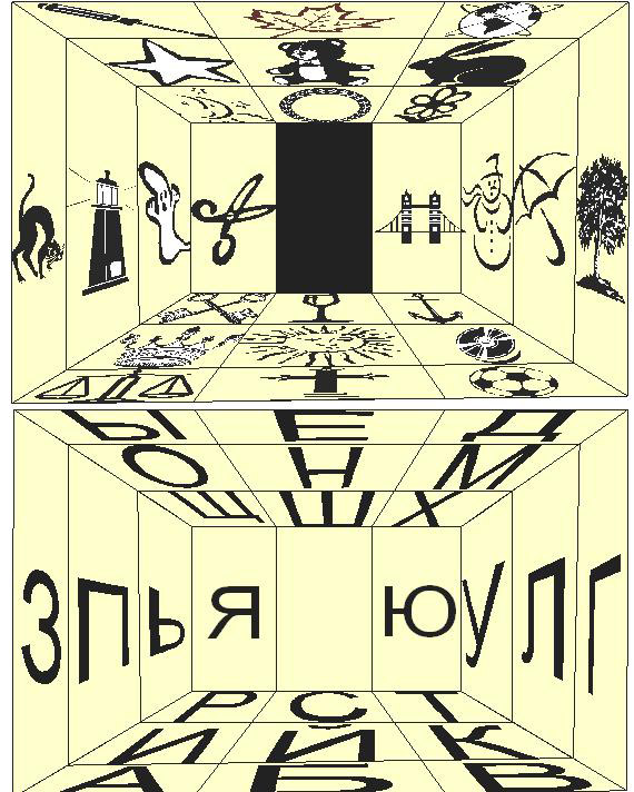 Две комнаты неспроста, определяем по верхней, буквы нижней. «зонт, лист, бокал, медведь, корона, пластинка».